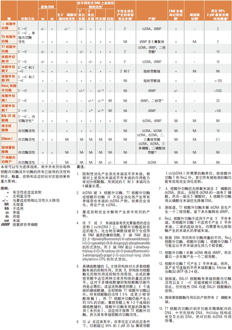 来自于NEB的核酸内切酶和核酸外切酶的特性。