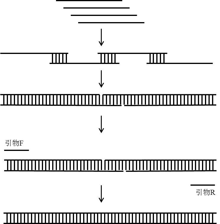 本方法基于“搭桥”PCR原理进行全基因合成。oligos靠3'末端互补序列相互退火,形成带有gaps的双链产物,再由DNA聚合酶补齐gaps,形成带有切刻的DNA双链,依此为模板进行PCR扩增即可得到目标基因,也可以直接使用带有切刻的DNA双链作为模板进行PCR扩增。本工具按照图示原理自动生成oligos,oligos具有统一的长度,按照节约碱基的原则设计,此外,oligos之间的重叠区的Tm相同,这有利于“搭桥”的均衡性,能够显著提高一步法PCR合成的成功率。一般不推荐单次PCR反应合成800bp以上的片段,如果目标基因较长,可以分段合成,然后通过Gibson重组或者长片段PCR“搭桥”的方式获得全长基因。另外,全基因合成对oligos的品质有一定要求,在合成oligos时请选择PAGE及更高纯度的纯化方式。