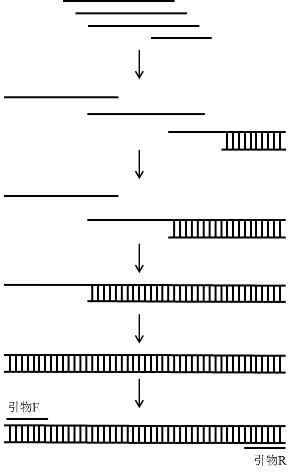 倒数第一条oligo与倒数第二条oligo靠末端互补序列相互退火,经过第一次PCR循环,双链延长,延长的双链与倒数第三条oligo继续退火、延长,......,依此类推,理论上有N条oliogs就至少需要经过N个PCR循环,就能得到全长序列,依此为模板进行PCR扩增即可得到目标片段。